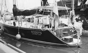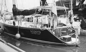 On Scoots, two freshwater tanks are built as ballast tanks, high under the deck and well outboard. On a heavy reach or beat, 200 gallons of water can be pumped into the windward tank, giving the weight equivalent of a half dozen beefy sailors to windward. In very light conditions, water can be pumped to leeward to increase heel and stabilize the sailplan.