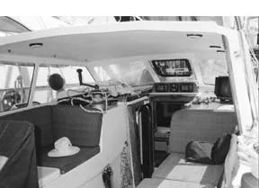 One of the best features of the boat is its sheltered cockpit. The shelter (“doghouse” is probably the proper term) is more a very large hard dodger than a true pilothouse, since its aft end is open to the weather. But it provides excellent shelter at sea, with two seats out of the weather, a space for charts, the radar, and the primary displays for the B&G Hydra performance instrumentation.