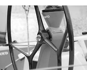 Interestingly, all of the boats also have anattachment point for the helmsman in the middle ofeach steering wheel. The helmsman is usually attachedto this point by a second short tether in addition tothe longer primary harness tether. The reason for this unusual arrangement is simple: These are light boats that get thrown around a lot by seas. In addition, tons of solid water comes over the decks, as there are no cockpit coamings or spray deflectors of any kind. During heavy-air reaching it’s easy for the helmsman to be thrown or washed off the wheel. The short tether makes sure that he or she will be able to regain steering control in extremeconditions.