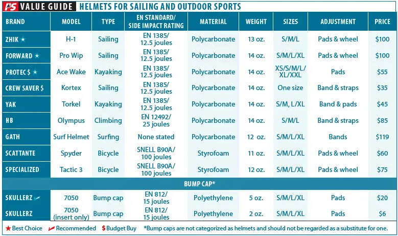 One could use a helmet designed other sports, but some are poorly suited for sailing. Construction helmets (hard hats) can protect against strikes at the top of the head, but the crown is typically 1.5-inches high and they arent designed for side impact. Bicycle helmets are light and give good protection against hitting the ground, but they offer less side coverage and can snag. Mountaineering and rescue helmets are tested with 2-4 times great impact energy, but may be more bulky. The adjacent table indicates the side-impact limits for the respective helmet standard.