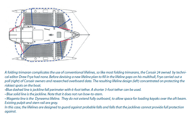 Our Corsair F-24 has no lifelines. Most folding trimarans don’t, because they are designed to fold onto a trailer,with the amas on their sides, resulting in the stanchions protruding awkwardly from both sides. Some were ordered with the factory lifeline option, and most of these were subsequently removed.