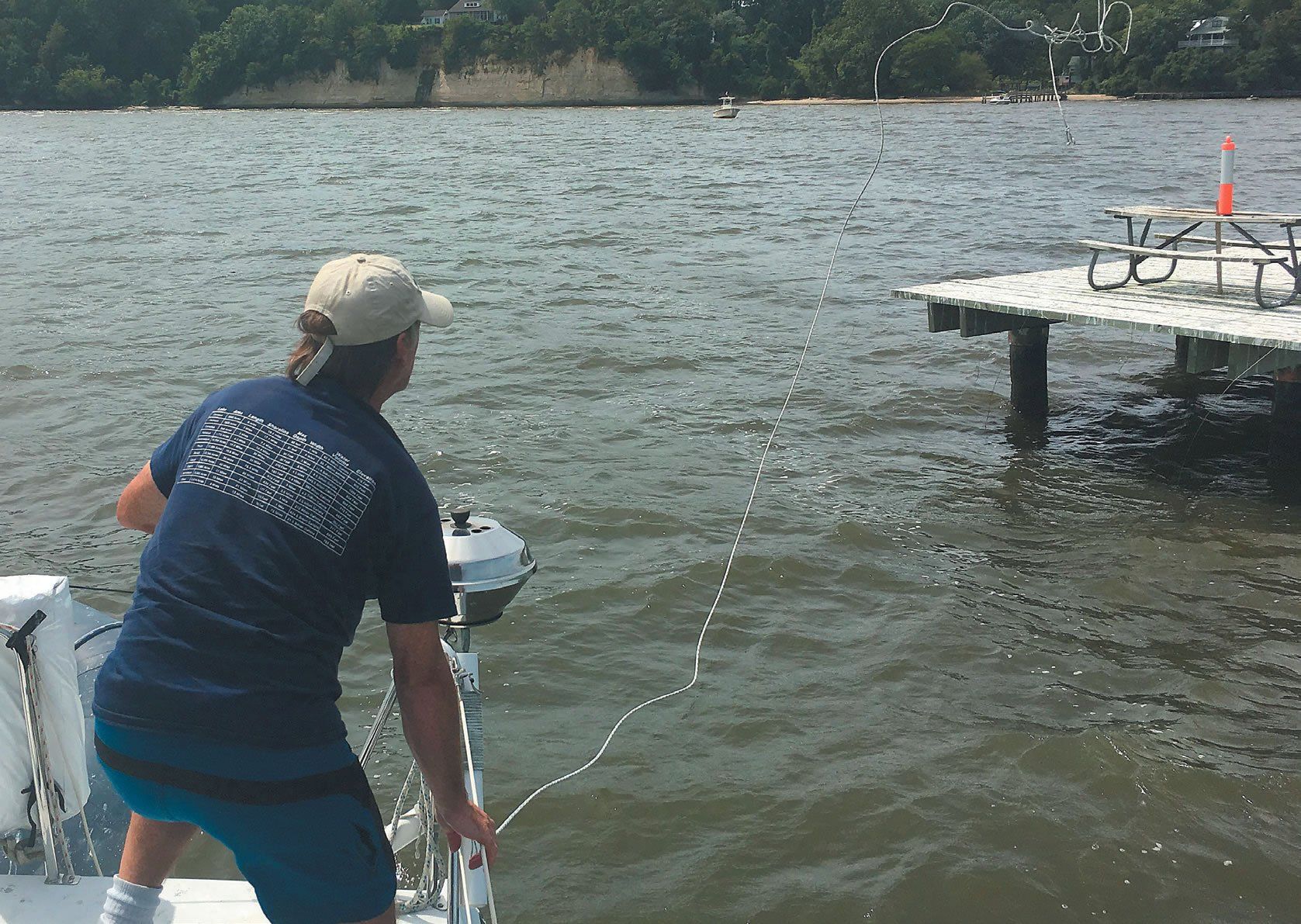 Keep a minimum 60-foot -inch line readily available, not buried deep in a locker; it can be handy both docking and in MOB situations. Properly pitched, there is no better way to quickly get a line ashore up to 40 feet away. However, any toss over 30 feet is difficult and the skipper needs to give instruction for any toss at all.