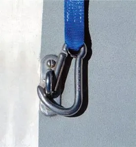 Most safety clips are vulnerable to unhooking if twisted or pushed in the wrong direction. All clips are weaker in this direction, and every effort should be made to clip from inside the U-bolt (spine toward the deck) so that the gate is not pressed against any solid object.