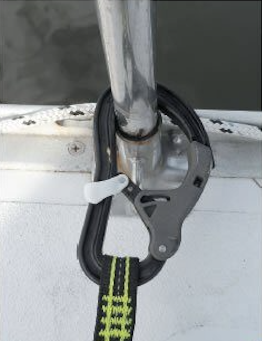 You should not clip into U-bolts and other hard points used for other rigging if this creates a cross load or could impinge upon the upon the gate—as it usually does. Instead, attach a small loop of line (5 mm Dyneema spliced into a loop) or a pre-fabricated Dyneema rock climbing sling. Do not use nylon-the UV resistance is inferior. A U-bolt cannot be shared by two sailors if crossing is possible.