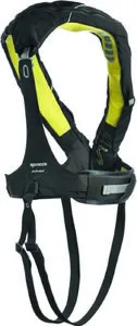Unless snugged uncomfortably tight, inflatable PFD/harnesses can slide up when under load, even so far as to allow the wearer to slip right out of the harness. One solution is to add a strap between the legs to hold the harness in place.
