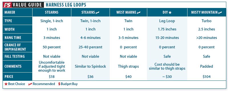 We tested single and twin crotch straps made from 1-inch webbing, Mustang Leg Straps, and our own leg loop design.