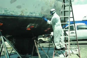 1. A scaffolding using 2 x 10 planks as walk boards is acceptable, but the lack of basic PPE like gloves and vapor protection when using high solvent paints isn’t smart. The bigger risk are the flip flops that the man on the right is wearing. Sandals are unacceptable in the boatyard.