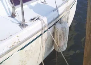 2. DON’T: A small, vertically hung fender did little to keep this boat from shaving the adjacent piling top to bottom. Note the wood shavings at the piling base and the peeled-back cap at its top, which is about 4 feet above normal water level.