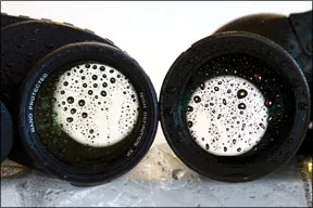 Testers dunked each of the binoculars to test this effect and found that the water drained off every one almost immediately. When we tested with a spray bottle to reduce the size of the water droplets, none of the bino lenses shed the water. (See photo, below left.) Steiner maintains that their spray tests showed that the coating allowed the water to shed easily.