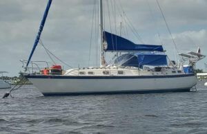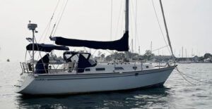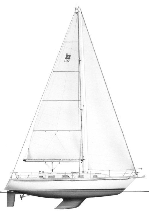 This low-profile family sloop was second only to the O’Day 40 in number of boats built by O’Day under its various owners. Founded by Olympic gold-medalist George O’Day to build one-designs and family daysailers, subsequent ownership expanded into trailer sailers and small- to medium-size coastal cruisers. Like the others, the 37 was designed by C. Raymond Hunt Associates. The center-cockpit is a bit unusual but some prefer it. The cruising fin keel and skeg-mounted rudder are well suited to shallow-water cruising, and the generous beam provides good form stability. The hull is solid fiberglass, and the deck is cored with balsa. Owners report it is well balanced and forgiving. Early 1980s models are on the market for less than $40,000, most asking in the mid-$30s. See a typical listing here.