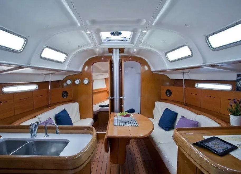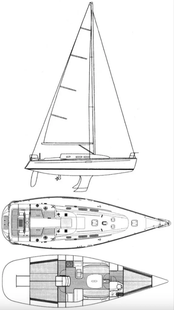 The boat’s numbers certainly suggest it will have better-than-average performance compared to its peers in the cruising world. The sail area/displacement (SAID) ratio is 21.01, the displacement/length (D/L) ratio is 160.6, the ballast/displacement ratio is 36.23, and its length/beam ratio is 3.20. Then again, this isn’t exactly the sort of boat one would take on a circumnavigation or perhaps even a trans-oceanic passage where most serious cruisers would prefer more keel and heavier displacement for sea kindliness and necessary stowage.