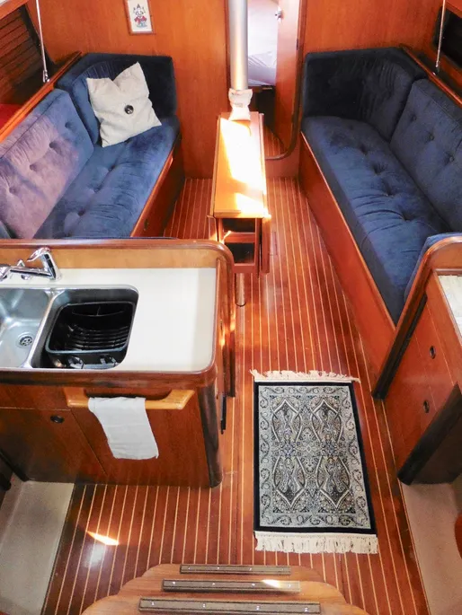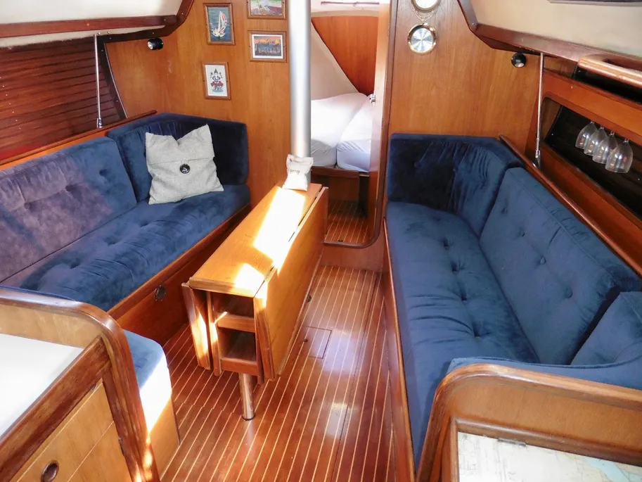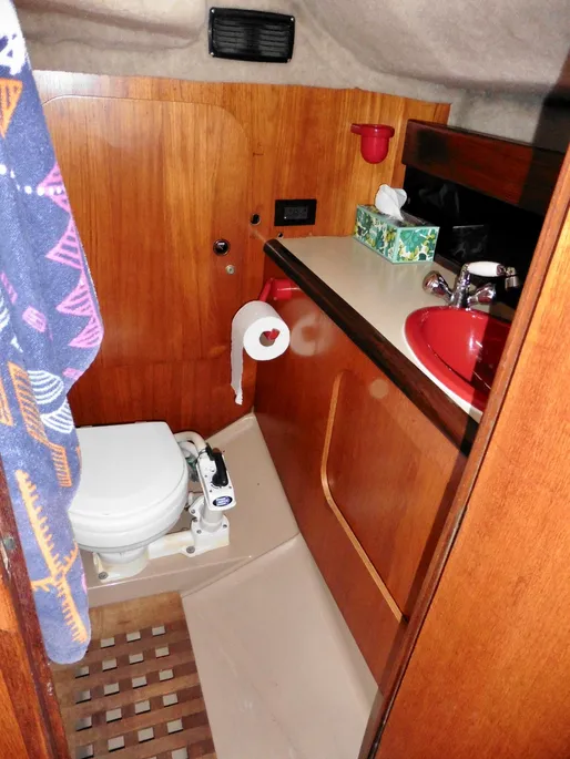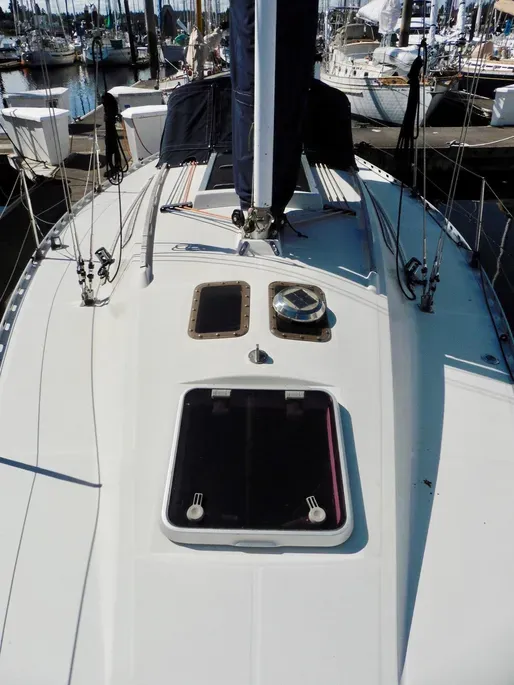 Deck, cabin top and cockpit are a single glass molding, with built-in nonskid surfaces where appropriate. The deck is balsa-cored, and the 1985 model we looked at exhibited some exposed core material visible from within the chain locker that had been saturated with water, according to a recent marine survey. That trouble spot could herald further the deck delamination, the survey concluded.