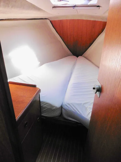 On an early October Saturday, with a moderately strong southeasterly wind blowing, Godzilla (nee’ Witch of the Waves) moved smartly out of Narragansett Bay on a close reach toward Brenton Reef tower. Sail consisted of an unreefed main of undetermined French make and a 140-percent roller furling jib from Ulmer-Kolius. The 345 is powerful and fast, and easily cut through the waves and over a cross swell coming in from the Atlantic. According to on-board instruments, the boat was moving along at close to its 7.1-knot hull speed on the reach—about normal for the conditions, the owners said. Switching to a beat, in 18 knots apparent, the boat naturally slowed (here, the crew attached the running backstays). On a run back toward the bay, Godzilla sped along at close to seven knots. With its fin keel and fairly light ballast, the 345 reacted to gusts but was easily controlled. The regular crew felt the helm was nicely balanced, but we detected a tendency to round up in gusts. Some owners responding to our questionnaire also cited annoying weather helm. The spade rudder, while requiring some working, made for fast tacking and quick response to the tiller. The owner of a 1987 model with a cutter rig reported excellent heavy-weather performance under staysail and reefed main. With a sloop rig, the boat flattens out when reefed before 20 knots. We’ve heard conflicting opinions about the shoal draft version’s pointing ability; based on our sail, the deep keel is closewinded. The most common complaint in our questionnaires was the boat’s poor speed and maneuverability under power. “Strong helm to fight when under power,” wrote one, whose boat was powered by the standard Volvo 2002. “My only complaint is that under power the boat’s performance is marginal,” another said. The owners of Godzilla, which was powered by a 28-hp, three-stroke Volvo 2003, had no such complaints. (Engine access from three sides, via the aft cabin and behind the companionway steps, is excellent.) The cockpit is roomy and comfortable with sufficient freeboard and beam to keep things dry from whatever spray was sent up by the bow. The outboard sides of the coamings, over which the crew can hike out, are patterned with nonskid—a nice touch and “something you won’t find on a cruising boat,” said a racer in the crew. Shrouds and lead blocks are inboard, allowing narrower sheeting angles. It is difficult, however, for the helmsman to reach the bridgedeck-mounted mainsheet traveler. Raise the jib, and you have a boat that’s best sailed by two. Clearly the boat is better set up for racing than short-handed cruising. Jibs are trimmed on #43 Lewmar winches retrofitted with cheap rubber collars that serve as a form of self-tailing. In reality, the setup was cumbersome and difficult to release under load; replacing them with genuine self-tailing gear is a priority of the owners. The interior of the 345 is neat, functional and roomy. The layout, in typical Euro-style, has an aft cabin, dual settees in the saloon and a surprisingly roomy double V-berth forward. The aft cabin, to starboard, is a little cramped vertically, especially the berth under the cockpit—okay for sleeping but not much else. (One couple mitigates this by sleeping athwartships.) Another owner found it the perfect enclosed playpen for his toddler. The 345 comes in a second configuration, with two tiny quarter cabins and the head forward of the main cabin. This version is favored by the charter trade, but the single aft cabin seems preferable for ordinary cruising. Aft and to port is the head. Both owners liked the location for its privacy and convenience. Like most enclosed heads on a boat this size, the compartment is a little small and could use a grabrail. The head is equipped with a Brydon marine toilet, fitted with a Y-valve leading to a holding tank. Gray water from the shower is led forward to a bilge sump behind the mast step. Fresh water was contained in two tanks under the settees, totaling about 100 gallons (379 liters). Some boats have rigid tanks; Godzilla has a flexible, bladder-type tank that seemed in good condition. Its light weight is another concession to performance, and it won’t last as long as a quality rigid tank. The L-shaped galley is forward of the head and equipped with a three-burner propane Electrolux stove. Refrigeration is an icebox. To starboard, there is a good-sized chart table, a bit cramped for head-room on the outboard side for anyone over 5-ft. 10-in. The main saloon is spacious, the double settees comfortable (one reader praised the quality of French foam). The amidships table contains Beneteau’s trademark wine rack plus additional storage space in the legs; beneath it is another trademark—the small bilge cover that converts to a dustpan. Headroom is more than six feet. Storage is ample and inconspicuous throughout. It’s almost impossible to find the inside of the hull because of the liner, the liberal use of teak veneer, and padding on the upper bulkheads and ceiling. The overall appearance is pleasant, not gaudy, and the padding is functional as well as aesthetic. Nevertheless, we’d hate to search for the source of a serious leak beneath all the interior decoration. In the original Beneteau First series, the settees and bunks were covered in subdued fabrics—green in this instance; the newer First S-series have the unusual Philippe Starck interiors with dark wood bulkheads and lots of silver and stainless steel, which one Beneteau employee said, “You either hate or love, but won’t forget.” The forward V-berth cabin, apparently the sleeping spot of choice for most 345 owners, is spacious, comfortable and private. There’s a hanging closet to port, drawers to starboard and lots of natural light from a translucent hatch. Natural lighting in the main cabin is supplied by side ports covered outside with a sporty, one-piece smoked Plexiglas panel. This is an inexpensive way to manufacture