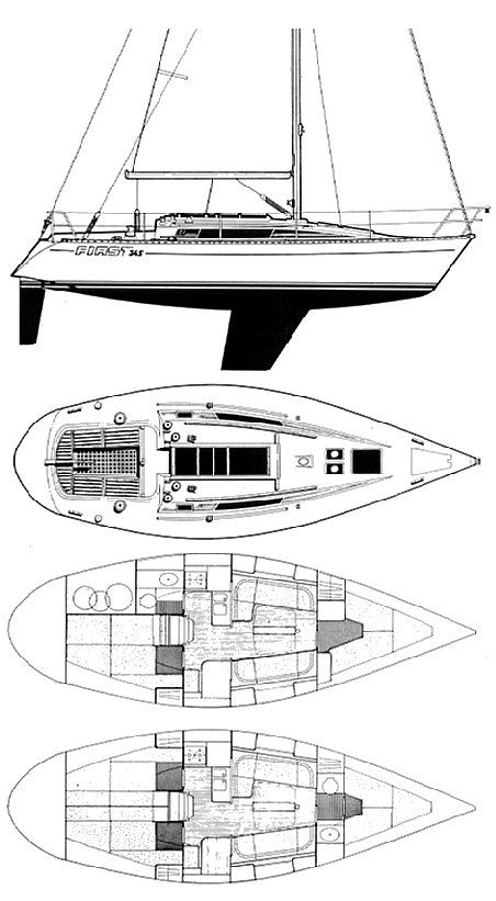 The Beneteau First 345 was designed as a moderate displacement racer/cruiser, and much of its popularity has been because of its success in blending the two functions. In fact, it could be said that the First is a racing boat that contains a cruising interior. The architect is Jean Berret, a Frenchman noted for his cruising and racing designs (he designed the 1985 Admiral’s Cup winner, Phoenix, a Beneteau one tonner).
