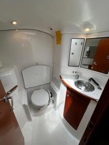 By comparison, the head in the bow is 46-in. long, 62-in. wide, so has significantly more elbow room since it spans the width of the boat. It has identical features, but with a larger vanity, a three-panel, mirrored medicine cabinet and sink, and toilet. Using a head in the bow, in even moderate seas, is an adventure, of course.