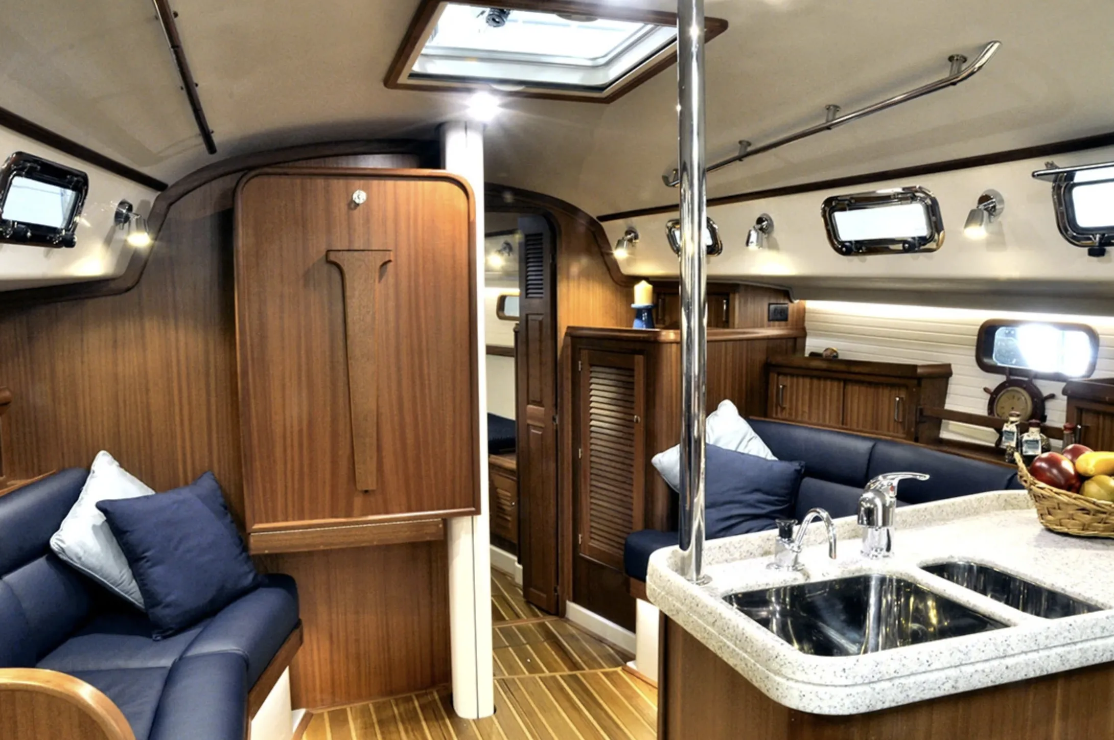 The Blue Jacket’s attractive interior includes a rich teak-and-holly sole, rich wood furniture and bulkheads and sumptuous upholstery. Note the overhead grab rails and the deep fiddles around the galley sink.