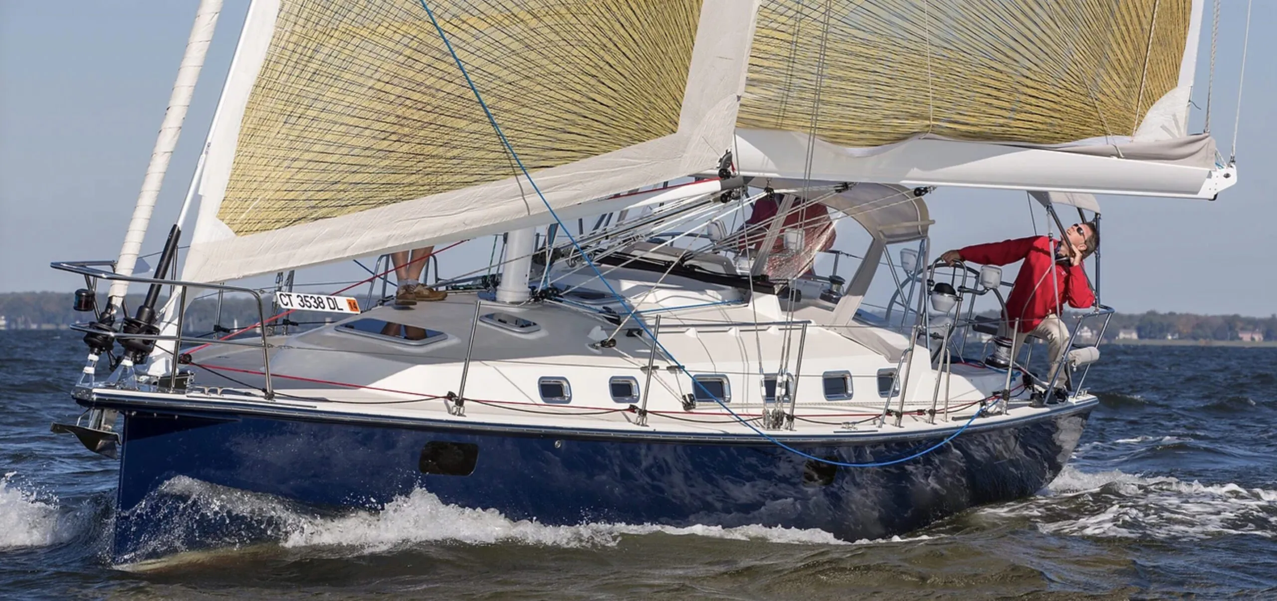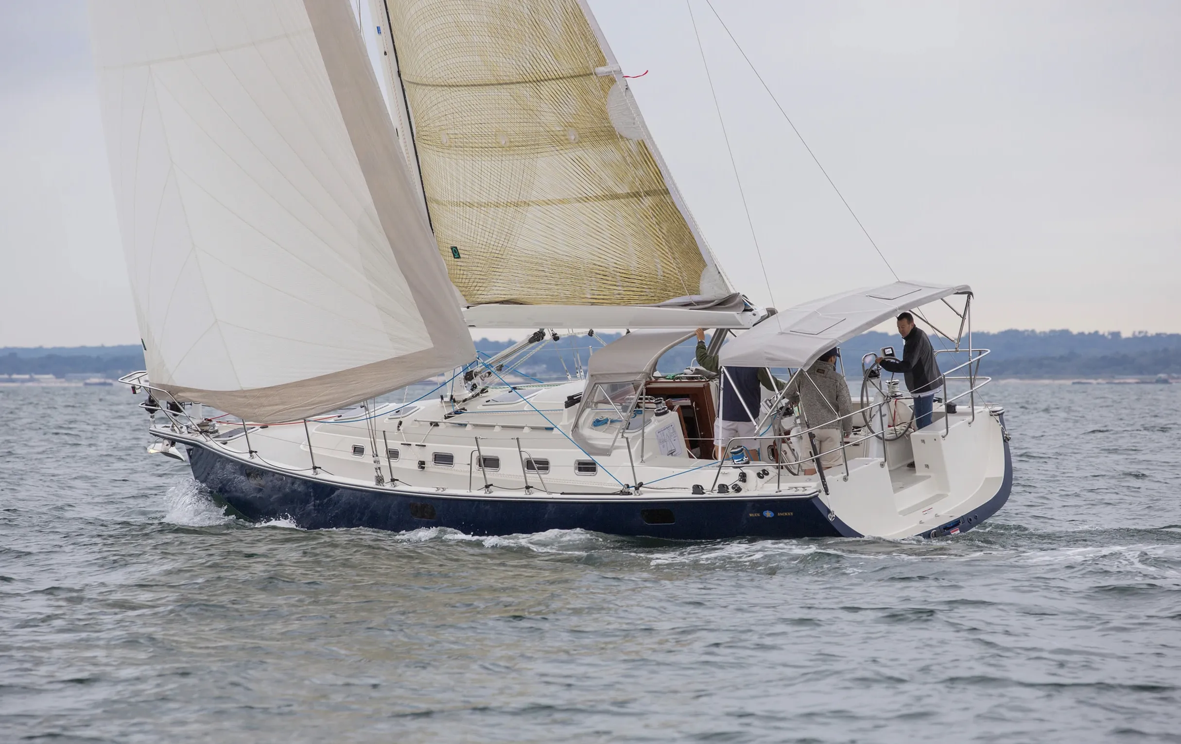 Twin helms and a scoop transom might be the fashion of the moment, but the Blue Jacket 40’s rig and sailplan are all business, with controls led to the safety of the cockpit and easy systems for shortening sail.