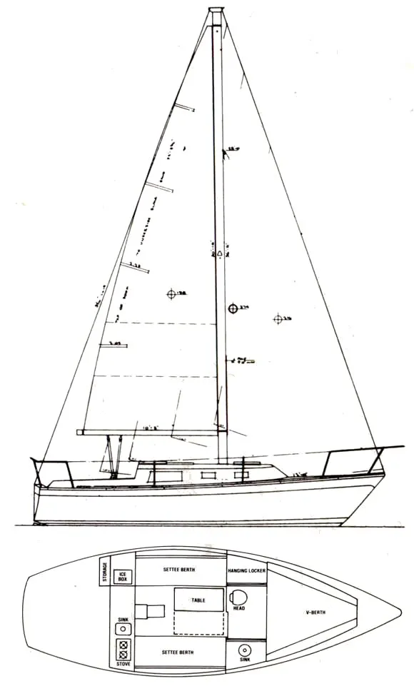 The rig is a masthead sloop with single spreaders and single lower shrouds. The original mast was untapered, made by SuperSpar or Kenyon, the two having slightly different dimensions. It was stepped on deck, supported by a compression post resting on a transverse fiberglass molding.