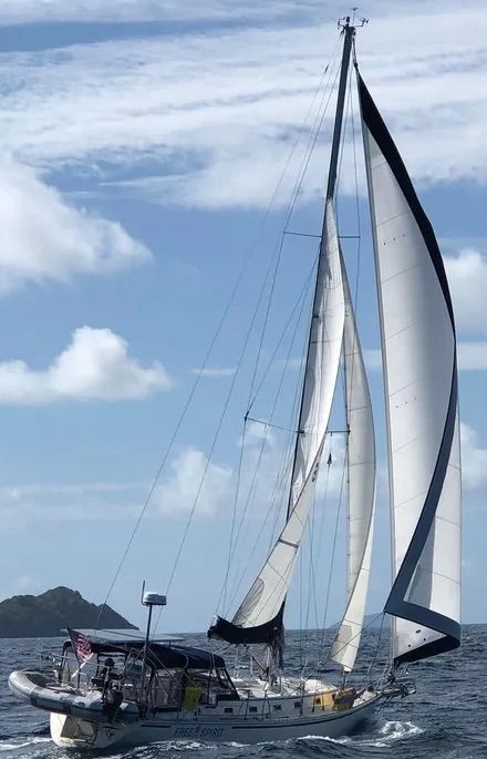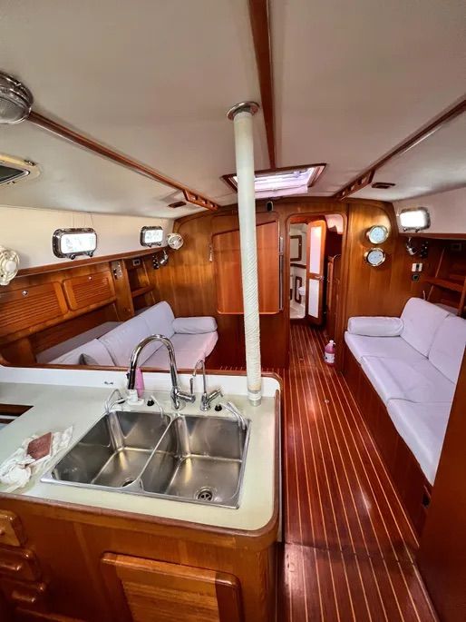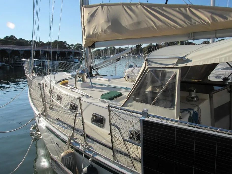 It has a relatively fine entry, bowsprit and bobstay, straight sheer, reverse transom, and flat coachroof. The displacement/length ratio is a moderately hefty 281, indicating it has the hull volume to carry necessary cruising stores. A Valiant 40 is 256, a Sabre 38 224, and a J/40 176.