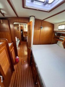 Sail area is 739 sq. ft., with a sail area/displacement (SA/D) of 15.3; that compares to a Valiant 40 at 15.5, falling in the general range for offshore cruisers.