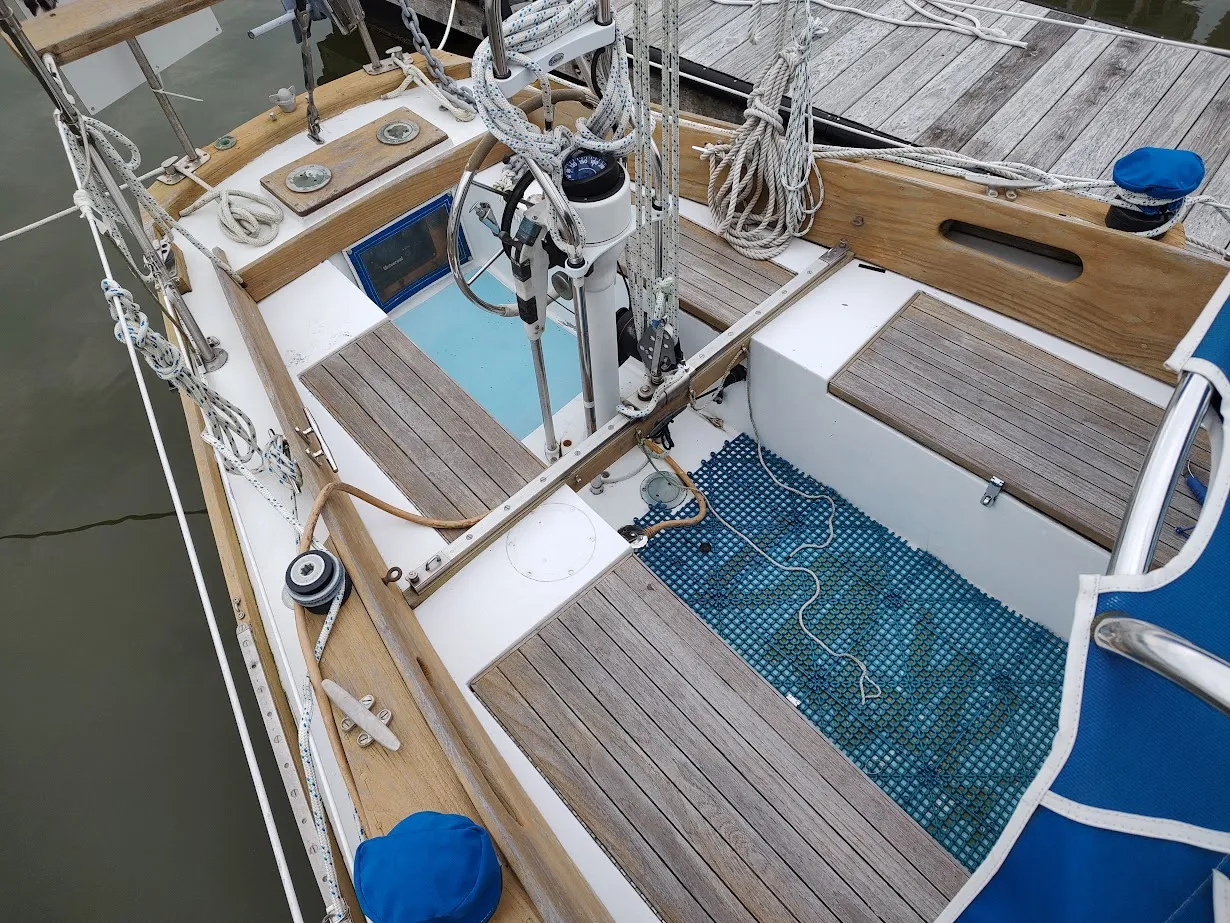 There’s a fair amount of exterior teak on these boats, including cockpit coamings, toerails, hatch trim, and eyebrow trim around the cabin on later models. This gives the boat a yachty appearance, but it does increase maintenance.