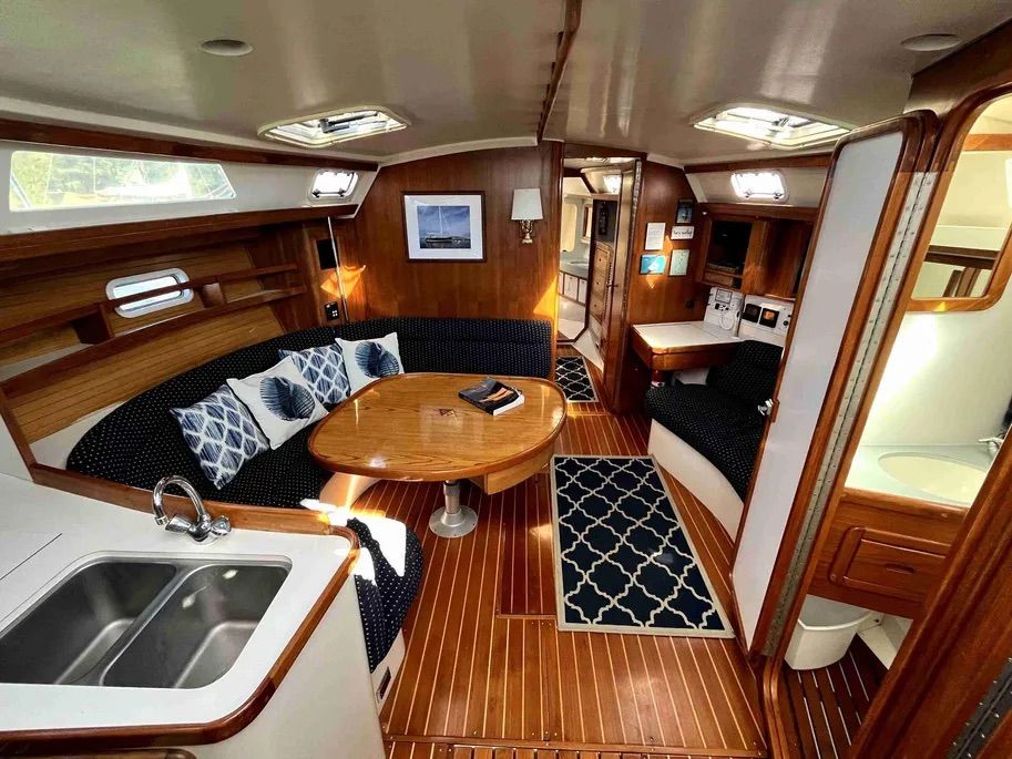 The cushions are mounted on plywood boards covering storage areas below the settees, which prompted one skipper to complain that they are heavy and cumbersome. They are especially risky if they should come loose with the boat heeled, which one owner said was a problem.