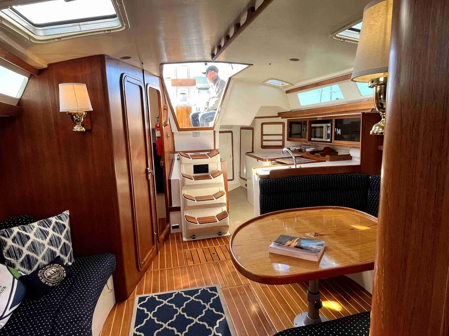 The two-stateroom model has an aft stateroom in the starboard quarter, a smallish head forward of it that’s about 38-in. square, a galley in the port quarter, opposing settees amidships, and a nav station to starboard with swing-out seat and large table.