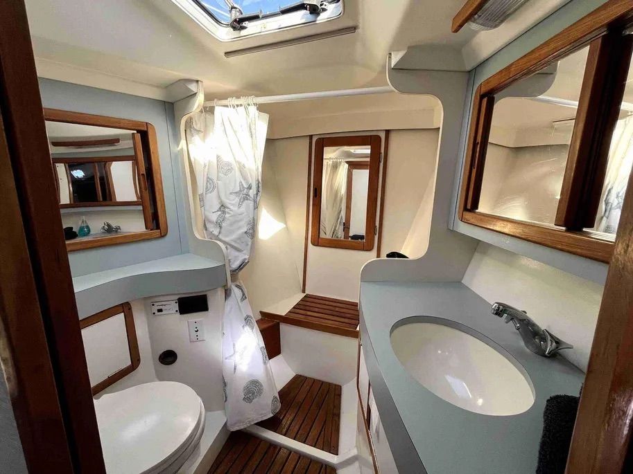 The boat is well ventilated and lighted by Lewmar hatches located in all living areas and in the heads, and hatches and fixed portlights are covered by bug and privacy screens.