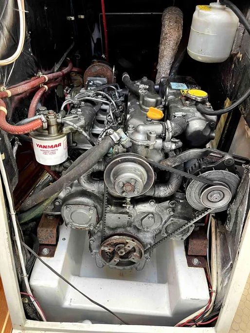 The engine is accessible from four sides. A small hatch in the starboard cabin leads to the oil filter. The companionway stairway reveals the front, and removable panels in the galley access the port side and aft end of the Yanmar 50.