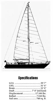 Several different engines were used in the C&C 40. Early models usually have a Yanmar 3QM-30. Later boats typically were fitted with a Westerbeke 30, although some boats were equipped with the more powerful VW-based Pathfinder engine.