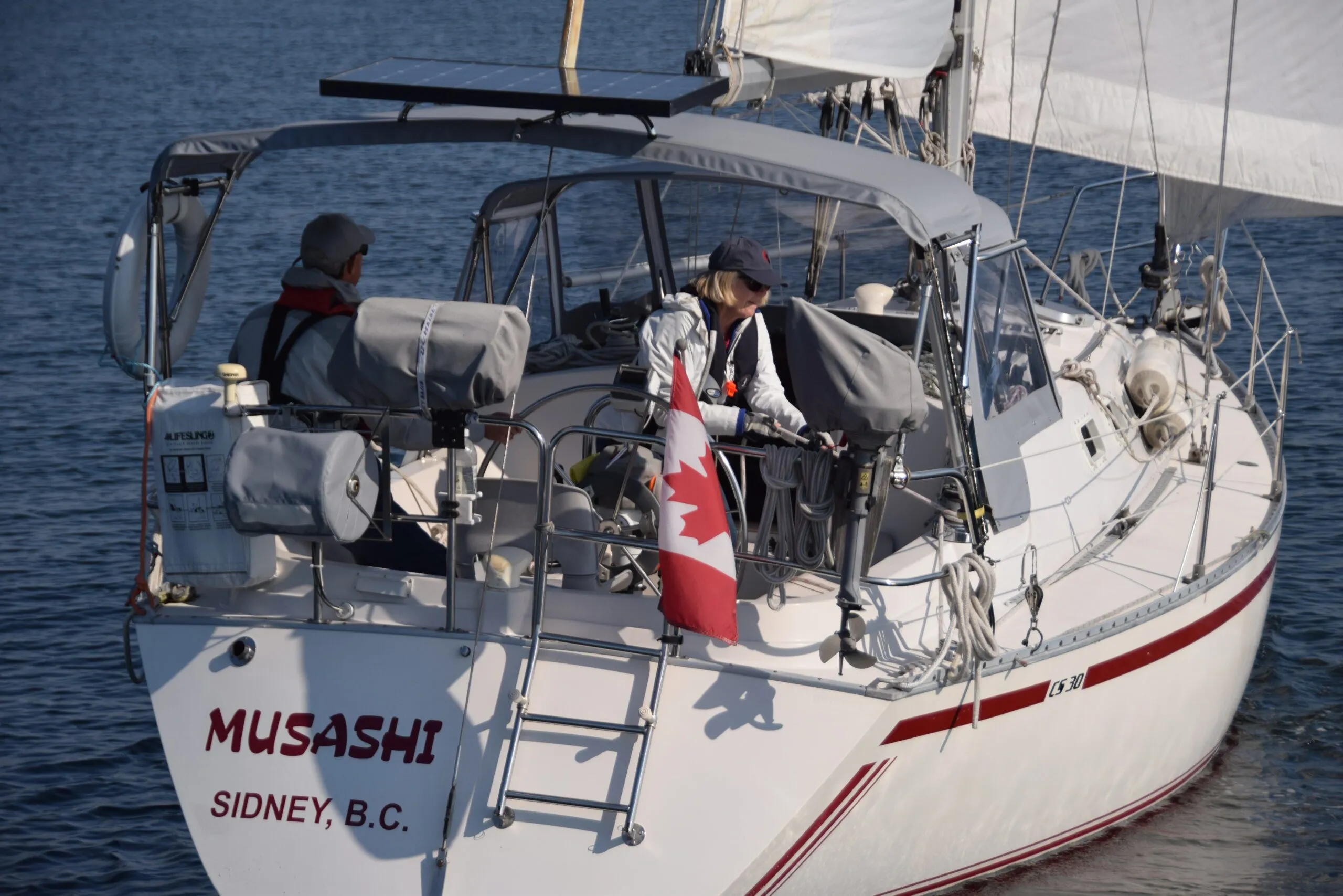 Jack and Marilyn Williams moved west from their home province of Ontario in 1977, settling on the Victoria area on Vancouver Island. One priority was to get out on the surrounding ocean water. Their first boat, an O’Day 27 purchased in 1978, was sailed extensively through the spectacular cruising grounds of British Columbia, including a voyage out to Barkley Sound on Vancouver Island’s wild west coast. With experience acquired, their horizons stretched further afield and they desired more carrying capacity and comfort. The search for a larger boat was on! A friend sailed a CS 36, a significantly larger boat, and it was a bit more than they were prepared to take on. However, they were impressed by the Canadian Sailcraft quality, and a review of a new-to-the-coast CS 30 caught their eye. Intrigued, they watched for listings in local boating magazines and found their perfect boat, a two-year-old model that met all their expectations. Jack and Marilyn were soon owners of Musashi, a 1986 CS 30 in pristine condition. They retained the Musashi name, a historical Japanese folk hero of the samurai era who was an author, artist, philosopher and swordsman. An artistic rendering of the hero remains framed on the cabin bulkhead.
