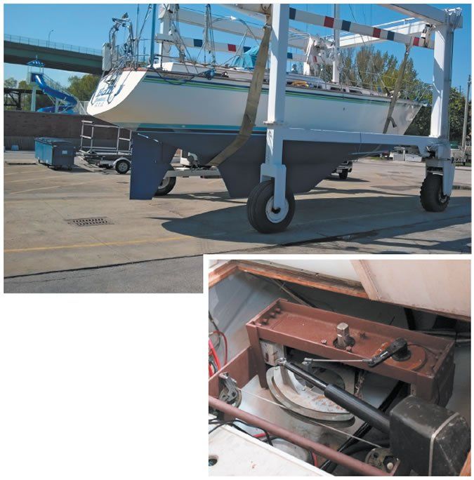 Rudder and steering: The rudder is molded as a single piece of solid, high-density foam with a protective skin of fiberglass, and a gelcoat finish. The stainless-steel rudder post is welded to stainless-steel blade and molded integrally with the rudder; high-density foam filler provides some stiffness. A stuffing box seals the shaft where it passes through the hull. The steering wheels chain and sprocket linkage leads to cables bolt to a massive support frame (see photo).