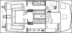 There is not standing headroom in the saloon forward of the 6′ 2″ pilothouse, but this isn’t a major item. Several interior plans have been offered over the years. The one we chartered had a 64″ x 75″ double berth forward in the starboard sector. The view from the bunk looking through the forward windows is stunning! The head with shower was in the port bow and aft, in each hull, was a quarter cabin. The 48″ x 75″ bunks in these weren’t quite as wide as a couple might like, but tolerable, and certainly more than big enough for kids. The nav station was amidships to port and the galley in the starboard hull, with 6′ 3″ headroom. Headroom forward is 6′ 0″ .