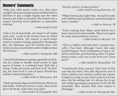 A frequent complaint of Gemini owners is gelcoat flaws. “Gelcoat has many voids,” wrote one owner. “Some gelcoat yellowing and crazing,” said another. The interior woodwork is acceptable to some owners, and not to others. “Woodwork finish is inept,” said one owner. “Finish work is my biggest complaint,” said the owner of a 1985 model.