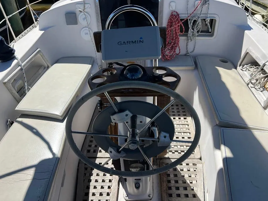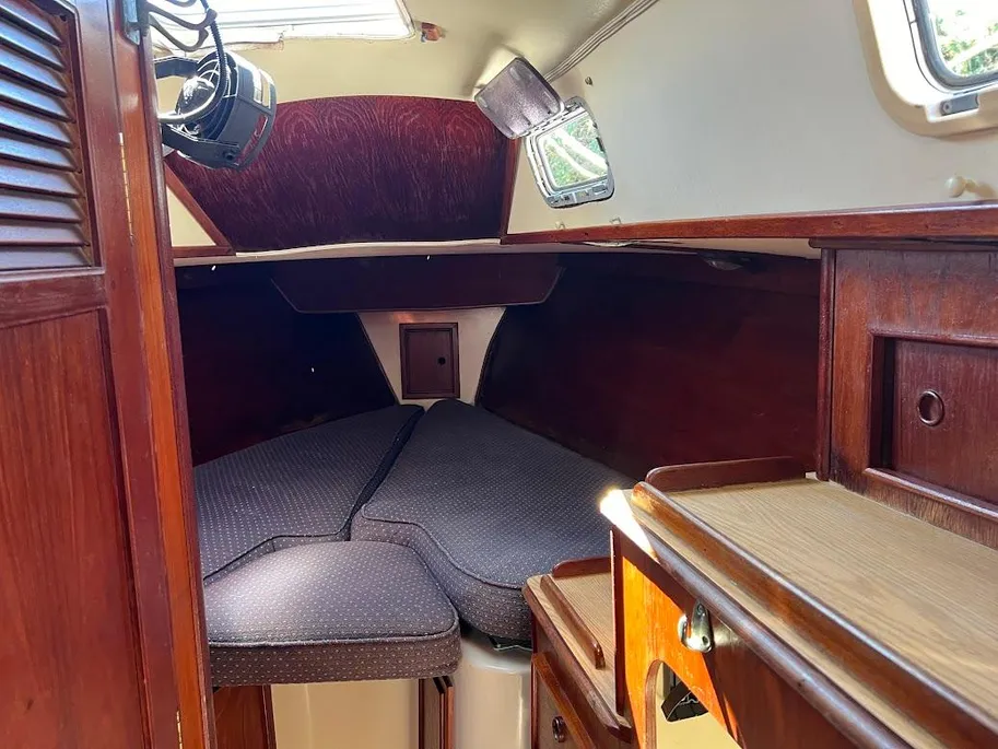 The interior of the 34 is generally well done, good production-line work with teak veneer and plastic. Some of the details of the cabinetry were a little sloppy on the boats we examined, but all in all the interior of the boat, when new, was undoubtedly a strong selling point. There are three good berths—a V-berth double and a quarter berth. The quarter berth will be just a little tight, especially at the foot, for a large, tall person. The settee is usable as a single berth (it’s a very comfortable settee), and the dinette opposite is convertible to a small double. The head is of good size, and the galley is well arranged in a sort of wraparound U. There’s a good electrical panel at the aft side of the galley. The nav station is set at an angle, with the table a bit small though adequate. The Irwin 34 came with seven opening ports as well as forward and midship hatches, so ventilation should be good. Stowage below is minimal, since tankage occupies space below the berths—a shortcoming of the modern hull shape. Tankage is adequate on the boat—30 gallons fuel, 80 gallons water, and a big holding tank for the head—a rarity on production boats of this size. There’s little bilge in the boat, which can cause problems when you take water inside the hull. This showed up in the discolored and delaminated teak/holly plywood on the cabin sole of two of the boats at which we looked. Original standard equipment is quite complete and modern—hot/cold pressure water, shower, propane stove, 4-in. cushions, AC and DC electrical systems, and so on, meaning that little upgrading should be necessary, assuming the boat has been well kept. Overall, the interior seems very desirable for a couple cruising or a couple with one or two children. There are no privacy doors for the forward cabin, so two couples will have to be (or become) intimate while cruising. The deck is conventional but well done for working the boat. There’s a deck-opening anchor locker forward, wide side decks, and a good big cockpit with a small ice/beer locker, two lazarettes, and a propane tank locker. A wheel was standard on the boat. A nice feature is that a portion of the cockpit sole is removable for superior engine access, the best we have seen on a boat this size. Cockpit drains are also large, another rarity on production boats. The companionway opening is large, with just a small lip/step above the cockpit sole. While not desirable in an offshore boat, this is okay in a coastal cruiser and makes for easy access to the interior. Most owners will want to arrange a way to secure the lowest companionway drop board, so it can be left in place during rough conditions. The mainsheet traveler is on the cabin top, just ahead of the companionway. While this is a convenient location, the boats we looked at had exceptionally unsightly dodgers because the multi-part mainsheet was somewhat in the way. The boat came with a Yanmar 15, which generally gets good reports from owners, though some think the boat is a bit underpowered. A 20-hp Yanmar was available as an option, and this would be desirable if a buyer were choosing between otherwise similar boats; the 20-hp model would be smoother running as well as more powerful. The boat we sailed handled adequately under power, though some owners report it difficult to back up straight. Most of the 34s had solid props, and the performance-oriented sailor will want to upgrade to a folding or feathering prop so the boat’s sailing ability isn’t hurt. The boat has a big rig, well balanced between mainsail and jib, and as you can expect from Ted Irwin’s design board, it is a good sailing boat. With a PHRF rating around 160, it is slightly slower than other cruiser/racers of that era, like the C & C 34, but it will make good passages, especially off the wind. Many owners report that they consider the boat quite tender, especially the centerboard model, but we found the boat to be reasonably stiff, with lots of initial stability from the beamy hull. We didn’t sail the boat in heavy air, but we suspect an early reef would be desirable. Cruisers will find that it works well to sail the boat under roller-furling jib alone. Early boats may have the DynaFurl roller which came as an option from Irwin, and buyers may want to factor in a replacement in their price figuring. The boats are generally of an age where the original sails are still aboard and, for all practical purposes, best used as drop cloths. Though the boat was advertised as a “club racer,” we saw no used 34s with spinnakers or any spinnaker gear, so a chute and related gear may also have to be purchased to complete a sail inventory. Standard winches on the boat were minimal, and an upgrade will be desirable if the original owner didn’t buy the optional package when the boat was new. The rig is adequate, the only problem reported by owners being paint problems on the mast, perhaps from a poor priming job on the aluminum. The mast of one boat we looked at had been re-painted. It is an excellent design, a wholesome all-around racer/cruiser with shallow draft that would serve a family’s needs as a coastal cruiser, at a reasonable cost. Unfortunately, the Irwin 34 suffers from some corner-cutting: details of construction which are cheap or shoddy, such as using only screws to secure the hull-to-deck joint. Realistically, those details should not hamper the boat’s use in normal conditions as a coastal cruiser, but are substandard compared to many other boats available. We generally would not recommend the boat to anyone contemplating ocean passages, unless considerable basic upgrading had been completed. But for a coastal cruiser, for an owner who likes to do some upgrading, the boat is a handsome, well thought-out design, with a good interior, well equipped. In today’s market, it offers a lot of basic boat, especially if bought at the right price.