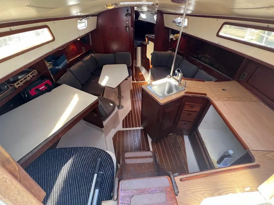 In design, the 34 looks like a cross between the old 1960s beamy CCA centerboarder and the mid-70s IOR racer, a combination that results in a moderate design and hence a healthy coastal cruiser. The bow has a distinctive concave curve, typical of many Irwin designs, and a flattish sheer, with a molded-in cove stripe to make the sheerline appear a bit higher in the bow. The stern sections have the peculiar tuckup typical of IOR boats of the era. The trunk cabin is traditional looking and fairly low. Overall, we think the boat is an attractive example of the modern racer-cruiser.