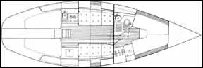 The arrangement is conventional. Forward you will find either sail bins or an optional V-berth, decently sized, with a head just aft of that, and a hanging locker and bureau opposite. Two comfortable settee berths are aft of the main bulkhead in the saloon, with an optional fold-up table between them.