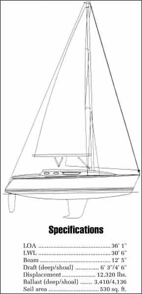In profile, the bow has a short overhang and the sheerline is nearly flat. Its displacement/length ratio is 193, which is moderately low, meaning there is not much volume below the waterline and that there is a definite emphasis on speed. But because the 36.2 is intended to be an all-around family boat, the sail area to displacement ratio is a relatively conservative 15.9. The sail plan offers plenty of power to move her, but shouldnt require unusually early reefing to keep her on her lines. Comparatively flatbottomed boats such as the 36.2 like to be sailed fairly level and may exhibit undesirable handling tendencies when heeled excessively.