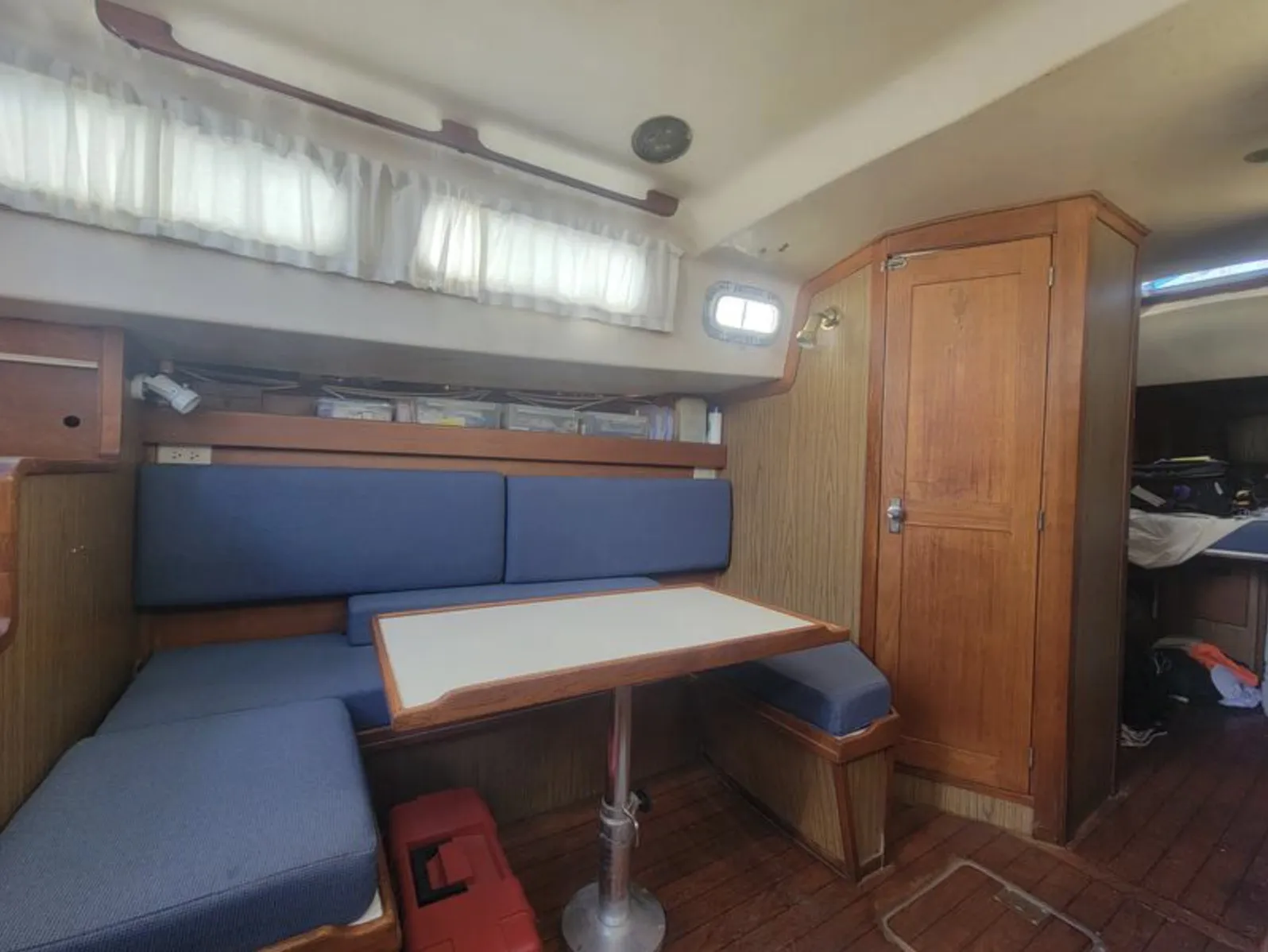 Other than the dinette, the layout of the 33 is definitely “traditional” with an athwartships galley aft, a small head, and an icebox lid that doubles as a chart table. The raised cabin trunk with large windows was a popular feature in production boats of this era, providing headroom, light, and cockpit protection.