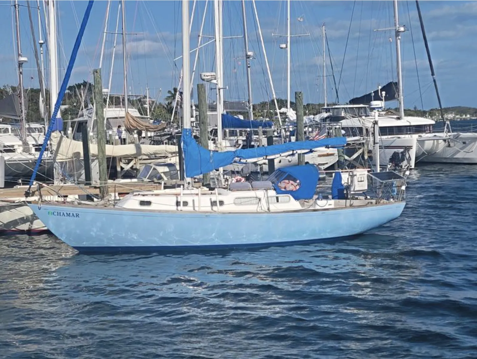 The 1960s produced a whole passel of smaller production yachts of a similar style designed by the likes of Phil Rhodes, Carl Alberg, Olin Stephens, and Ted Hood. These are quite traditional boats with moderate overhang fore and aft, modest topside height, full keel, heavier displacement, low aspect rig, and perky sheerline.