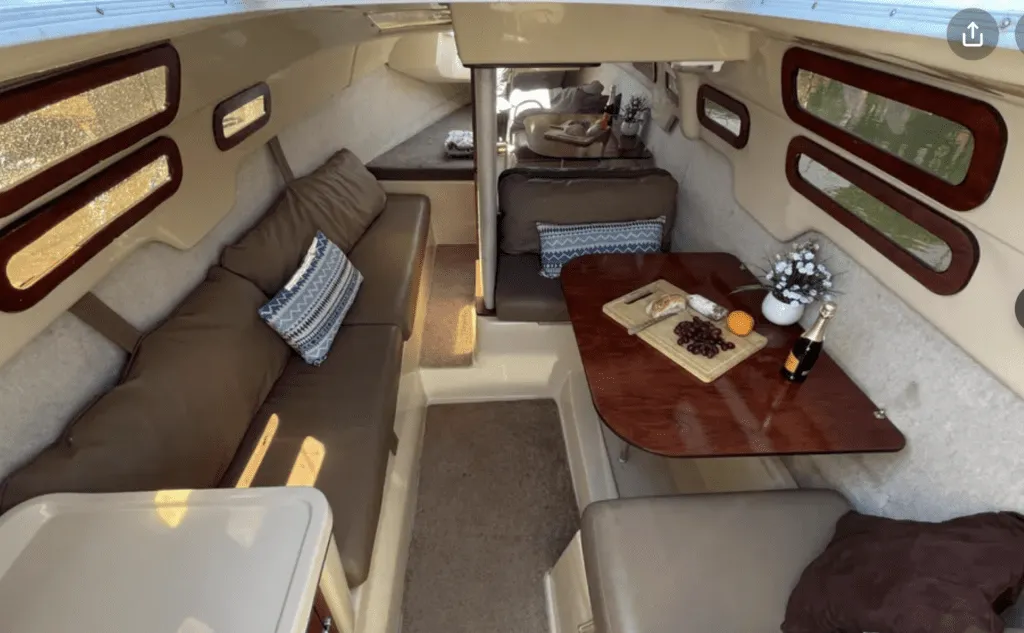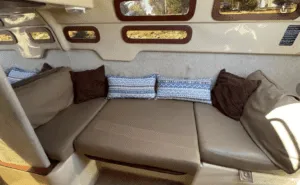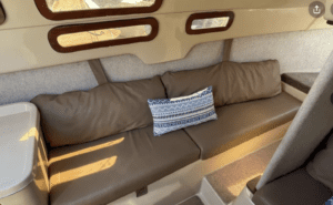 The port side settee lounge becomes a comfortable spot for getting out of the rain. Adding shelves and storage solutions to address the lack of stowage