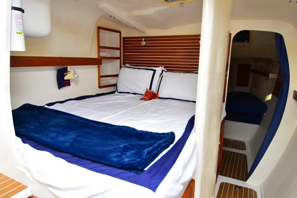 Headroom is abundant: up to 6-feet, 9-inches in both hulls. There is no saloon, but the cockpit is more than big enough to facilitate socializing. Hull windows in the galley (to port) and dressing room (to starboard) also offer a view of the outside. With 15 portlights and hatches in the hulls, the interior is bright and very well-ventilated. The decor is white-painted fiberglass and gelcoat trimmed with satin-varnished cherry, though relatively Spartan compared to other cruising cats. “It’s a bit stark, but you can see what problems you’ve got,” said one owner.