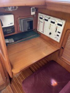 Opposite the galley is the navigation station, with an adequately sized chart table and a sort of “screen” bulkhead to protect charts and electronics from sea or rain water entering through the companionway. The electrical panel is beautiful.