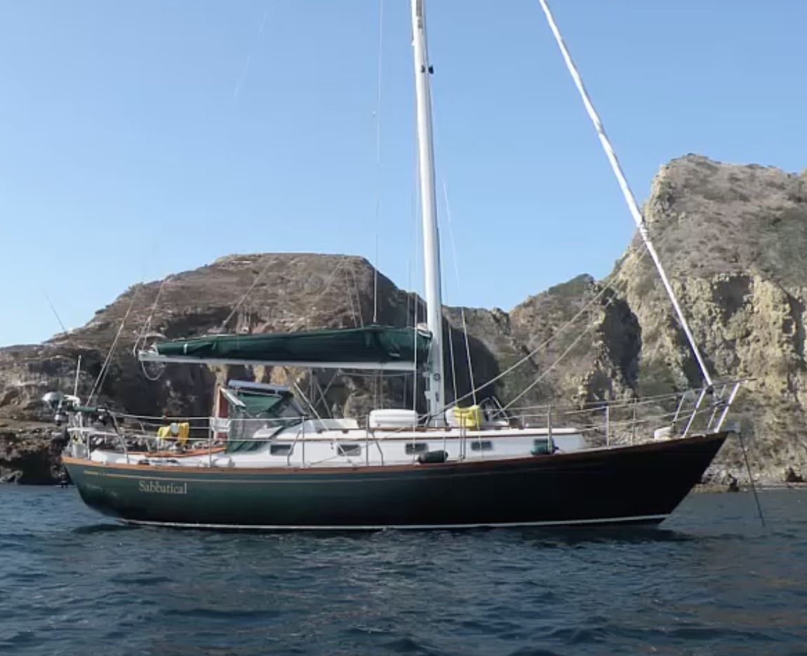 The boat we sailed had a two-blade prop and the Westerbeke diesel, and we found that the boat generally behaved well under power, being just a mite disinclined to back up in a straight line. Otherwise, she tracks and turns well, though long keel/attached rudder boats always have a longer turning radius than the fin keel/separate rudder models most people are accustomed to these days.