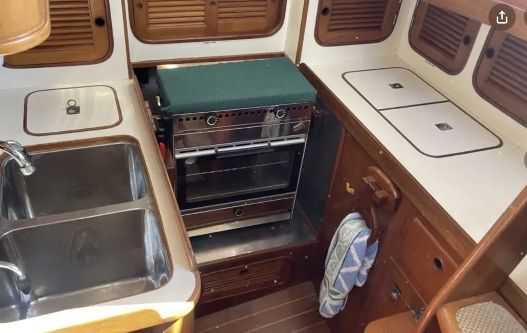 The galley has ample fiddled counters and good deep sinks and should work well under sail. At anchor, it’s awkward in that the floor rises to follow the hull contour. The icebox is big enough and apparently well insulated, hot and cold pressure water are standard, and there are two water tanks for a total of 65 gallons.