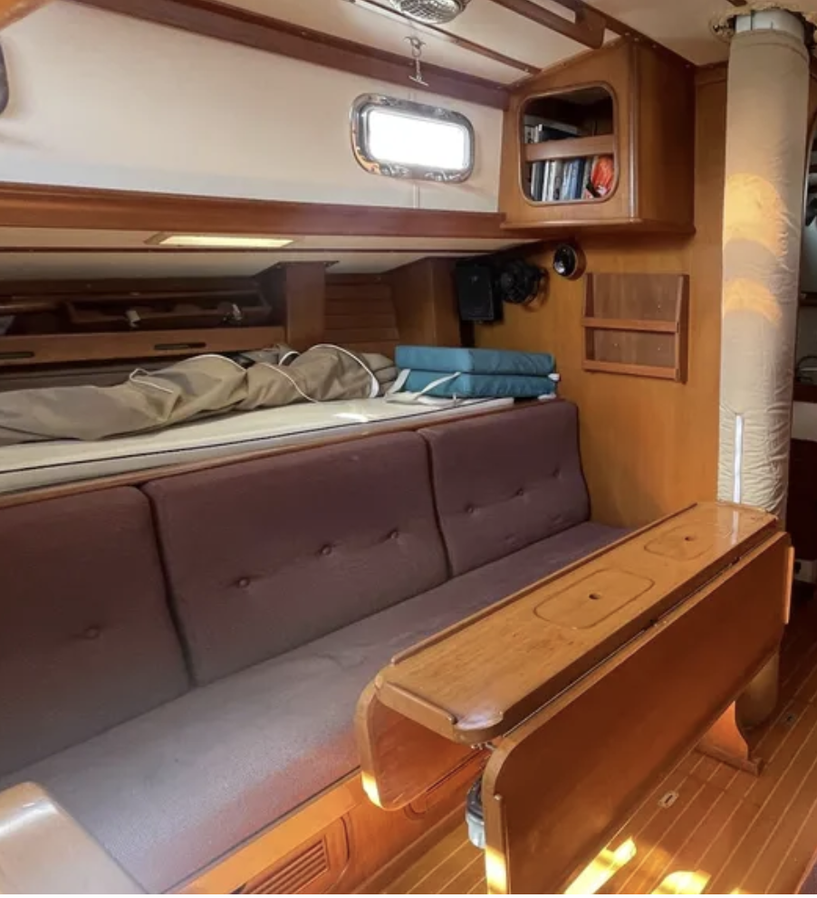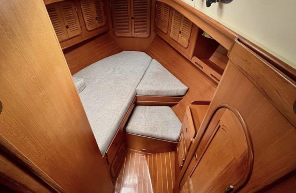 Settees are port and starboard of a centerline table, and a pilot berth is available portside, though most owners will likely use the space for storage. The head has a shower which drains into the sump tank, good storage space, and a decent wash basin.