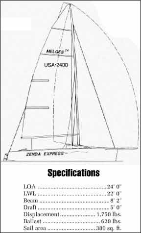 Three of the characteristics that attracted boaters to the J/24 incited the Melges revolution: They are fast upwind and really fast downwind, well constructed, and trailerable. Because the new boat benefits from 15 years of design and construction improvements, comparisons to the J/24 are almost unfair, but do provide a frame of reference. For example: The J/24 is 20 feet on the waterline, weighs 3,100 pounds, carries 950 pounds of ballast, and flies 263 square feet of sail under a jib, 476 under spinnaker. Under PHRF, the J/24 typically rates in the 170s.