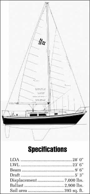 Despite a fairly high ballast/displacement ratio, owners report that the boat is tender. This is due in part to the fairly round midship section, and in part to the fact that few 28′ boats are really very stiff.