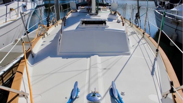 The chainplates are mounted outside the hull for easy inspection. The exterior plates are made of ¼-in. x 2-in. type 304 stainless steel fastened with carriage bolts to 1/8-in. thick stainless-steel plates bedded on the hull interior. Their placement outboard makes for a wider shroud base, which is stronger but makes for wider sheeting angles that affect pointing ability. But because most other modern boats of this size generally have a foot or so more beam, the Crealocks end up with about the same sheeting angles as a beamier boat with inboard chainplates.
