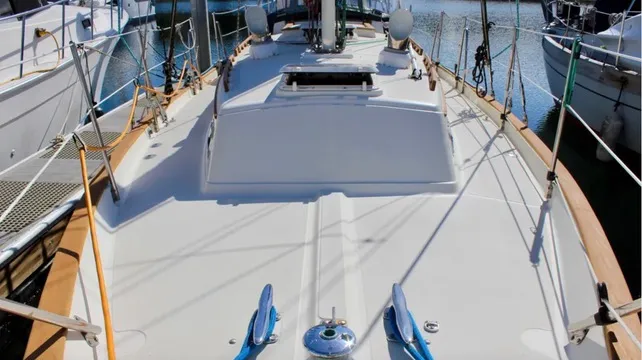 The deck layout and hardware also reflect the boats blue-water heritage.